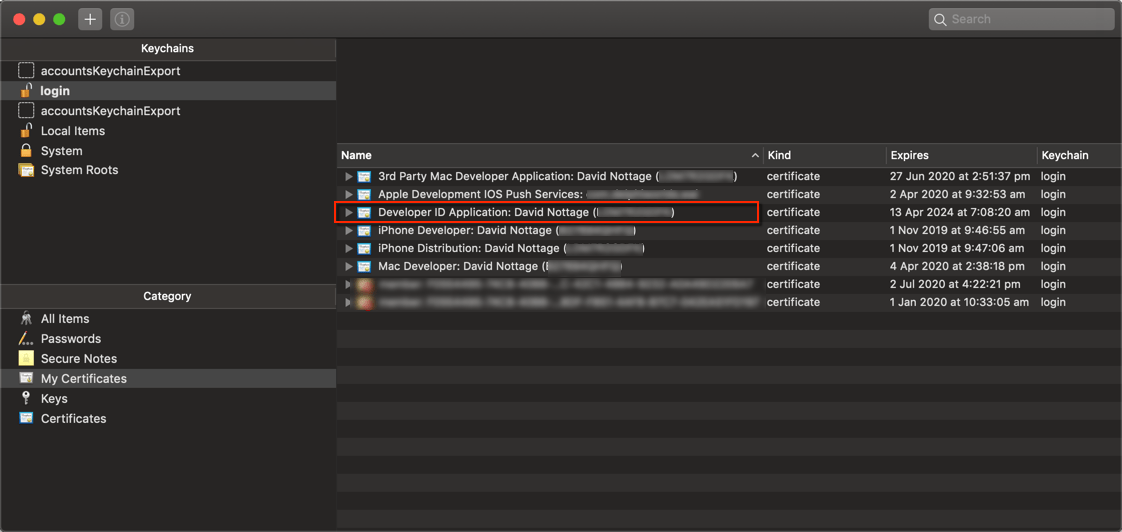 That’s it! Xcode generates the certificate for you, and adds it to the Keychain. If you open the Keychain Access app (in /Applications/Utilities), you should see the certificate there: