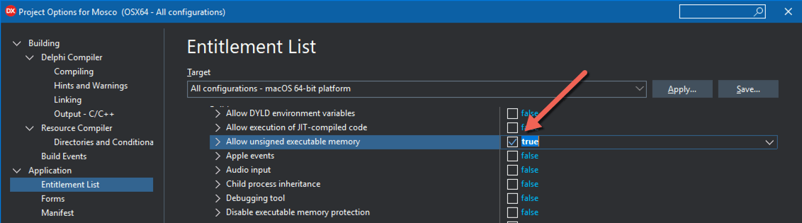- Check the “Allow unsigned executable memory” option. In later versions of Delphi, this will be set by default.